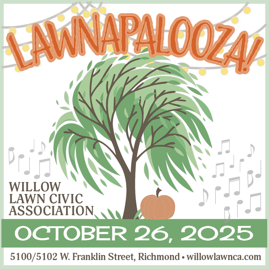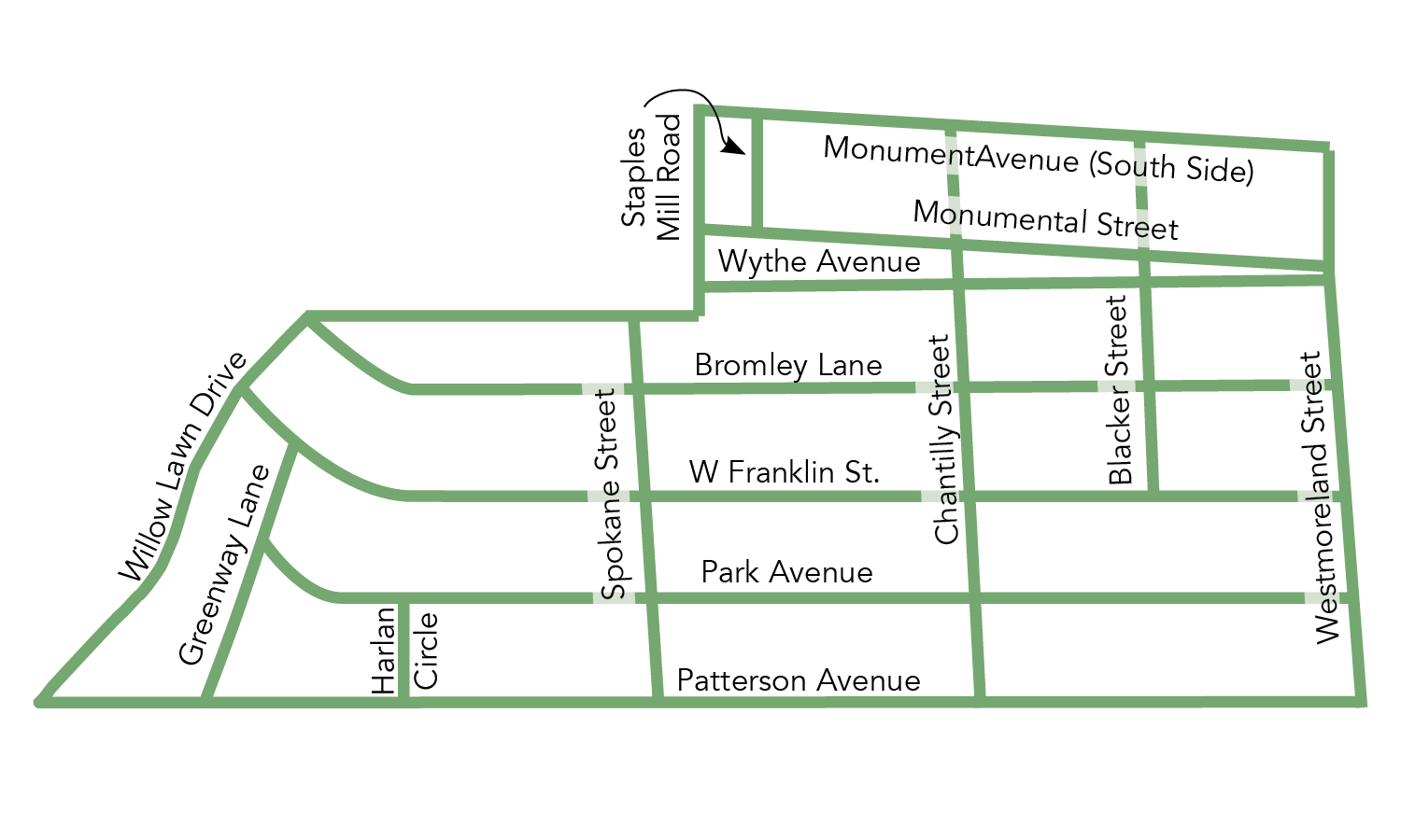 The Willow Lawn Civic Association includes the Richmond City homes between Willow Lawn Drive to Westmoreland Street and between Monument Avenue to Patterson Avenue.